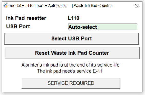 The Epson L110 resetter is a compatible waste ink pad counter resetter for the Epson Ecotank L110 printer. An ink pad resetter provides a reset of the waste ink pad counter of your printer. The L110 inkpad resetter can solve the error notification, SERVICE REQUIRED: A printer’s ink pad is at the end of its service life, a part inside your printer is at the end of its service life, the ink pad needs service, or a printer’s ink pad is nearing the end of its service life.