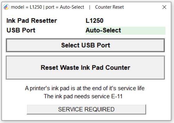 The Epson L1250 resetter is a compatible waste ink pad counter resetter for the Epson Eco tank L1250 printer. An ink pad resetter provides a reset of the waste ink pad counter of your printer. The L1250 inkpad resetter can solve the error notification, SERVICE REQUIRED: A printer’s ink pad is at the end of its service life, a part inside your printer is at the end of its service life, the ink pad needs service, or a printer’s ink pad is nearing the end of its service life.