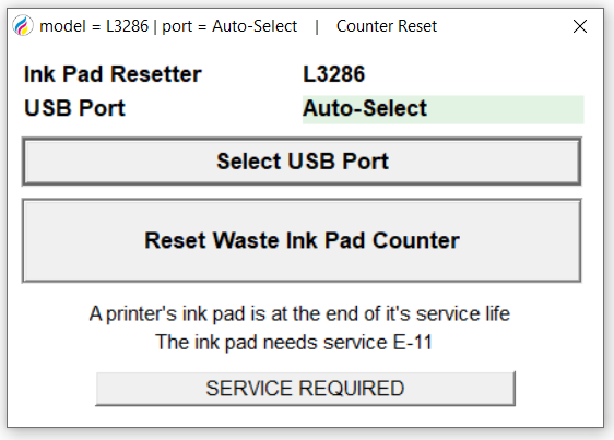 The Epson L3286 resetter is a compatible waste ink pad counter resetter for the Epson Eco tank L3286 printer. An ink pad resetter provides a reset of the waste ink pad counter of your printer. The L3286 inkpad resetter can solve the error notification, SERVICE REQUIRED: A printer’s ink pad is at the end of its service life, a part inside your printer is at the end of its service life, the ink pad needs service, or a printer’s ink pad is nearing the end of its service life.