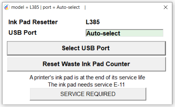 The Epson L385 resetter is a compatible waste ink pad counter resetter for the Epson Eco tank L385 printer. An ink pad resetter provides a reset of the waste ink pad counter of your printer. The L385 inkpad resetter can solve the error notification, SERVICE REQUIRED: A printer’s ink pad is at the end of its service life, a part inside your printer is at the end of its service life, the ink pad needs service, or a printer’s ink pad is nearing the end of its service life.