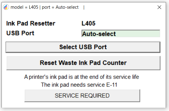 The Epson L405 resetter is a compatible waste ink pad counter resetter for the Epson Eco tank L405 printer. An ink pad resetter provides a reset of the waste ink pad counter of your printer. The L405 inkpad resetter can solve the error notification, SERVICE REQUIRED: A printer’s ink pad is at the end of its service life, a part inside your printer is at the end of its service life, the ink pad needs service, or a printer’s ink pad is nearing the end of its service life.