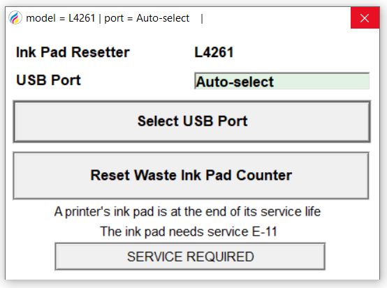 The Epson L4261 resetter is a compatible waste ink pad counter resetter for the Epson Eco tank L4261 printer. An ink pad resetter provides a reset of the waste ink pad counter of your printer. The L4261 inkpad resetter can solve the error notification, SERVICE REQUIRED: A printer’s ink pad is at the end of its service life, a part inside your printer is at the end of its service life, the ink pad needs service, or a printer’s ink pad is nearing the end of its service life.